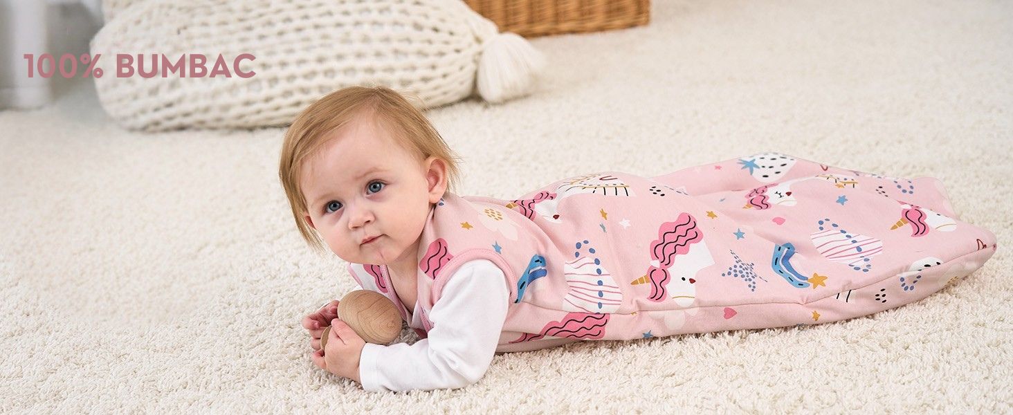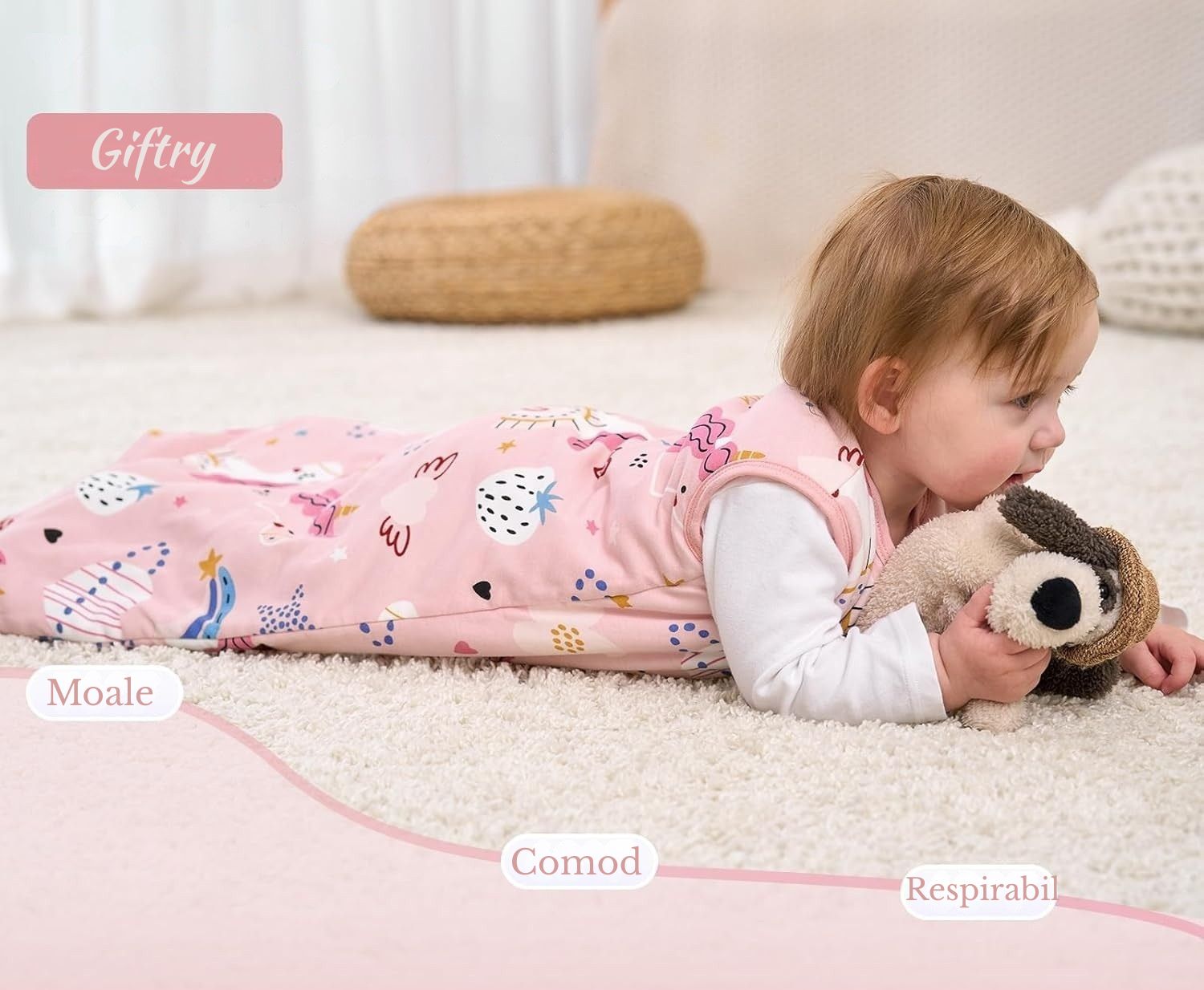 Giftry® Sac de dormit pentru bebelusi, 6-18 luni, 100% bumbac, 1.0 TOG, fara maneci, fermoar dublu, confort termic, model unicorn, roz